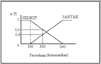 Persediaan; terdiri atas dua himpunan samar, yaitu: SEDIKIT dan BANYAK.