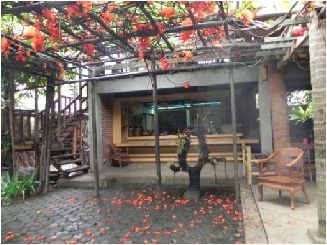 dan meja kayu. Di lantai atasnya terd apat area untuk latihan dan men yimpan angklung.