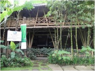 Sebuah pendopo rendah dilengkapi banyak kursi panjang (bale) dari bambu